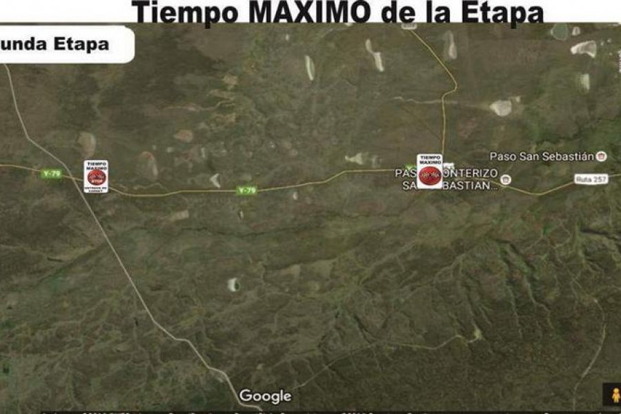 d). Segunda etapa: La Pancarta estará ubicada en Las Flores, antes de la curva de 90° a la izquierda; la misma será colocada a la hora indicada; con la leyenda TIEMPO MAXIMO -ENTREGA DE CARNET. Personal del Automóvil Club Río Grande retirará el mismo y los binomios podrán continuar hacia Porvenir YA FUERA DE COMPETENCIA, utilizando solo la Ruta Y79 (no pueden ingresar a los tramos de competencia por la Ruta Y895)