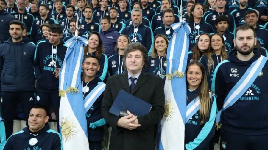 El presidente Javier Milei despidió a los atletas argentinos que participarán de los Juegos Olímpicos de París 2024 en una ceremonia llevada a cabo en la sede del Centro Nacional de Alto Rendimiento Deportivo (CENARD) y remarcó que “todo lo que logren será fruto del gran trabajo que hacen”.En su discurso, Milei deseó el "éxito a todos porque si llegaron hasta aquí, y si encima tienen la proeza de volver con una medalla, no será por azar sino por el camino de sacrificio que han recorrido y por el empeño que han puesto en perfeccionarse y competir".Y agregó: "Es un orgullo inmenso proporcional al tamaño del servicio que le brindan a la Patria, porque se trata de demostrarle al mundo entero quiénes somos como argentinos: un pueblo creativo y trabajador, que se esfuerza por la excelencia, que sabe bien lo que es sobreponerse a la adversidad y abraza la competencia".Javier Milei junto a los abanderados de los Juegos Olímpicos