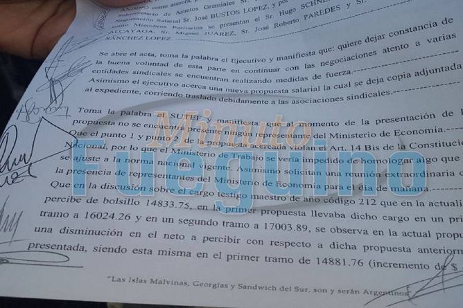 “Esto es una burla”, dijo el paritario Héctor López Auil, una vez finalizada la reunión. Además agregó que “entre la propuesta anterior y esta ofrecen $15.000 pesos menos”.
