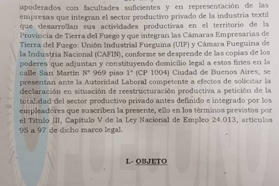 Adelantó que “no lo vamos aceptar, nosotros entendemos la situación. Estamos en un Gobierno neoliberal que desde el 2015 el Gobierno de Macri provocó estas cosas. Cabe señalar que las fábricas textiles que pretenden esto son: Textil Río Grande, Cordonsed, Teogrande, Australtex, Hilandería Fueguina y Fabrisur.