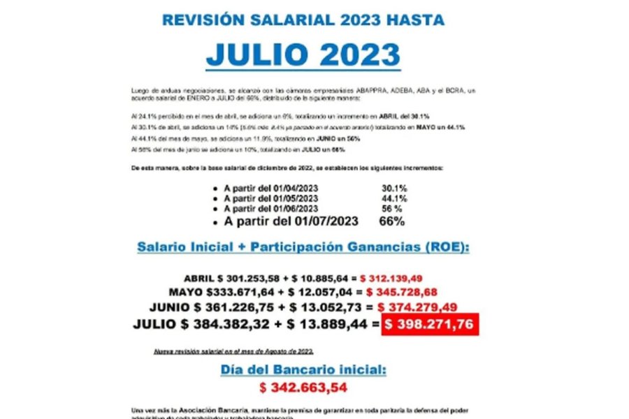 En julio, se le complementarán otros 10 puntos, para totalizar una suba salarial total de 66% y llevando al piso salarial de los bancarios a $398.271,76.