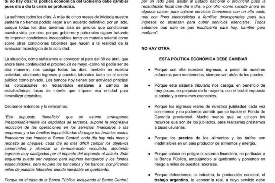 \"La política económica debe cambiar. A más de cinco meses de iniciada la paritaria bancaria no fue posible alcanzar un acuerdo definitivo, porque a diario hay alzas de precios que condicionan y porque gobierno y patronales procuran imponer condiciones inaceptables para salarios y condiciones laborales en el área tecnológica\", afirmaron.