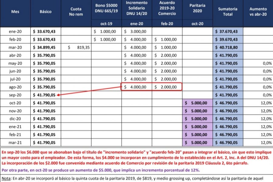 Por otra parte, a partir del mes de septiembre de 2020 quedan incorporadas a los salarios básicos de todas las categorías la suma de $4.000 del decreto 14/2020 otorgada en marzo y la suma de $2.000 acordada en febrero homologada por la resolución 204/2020. Las partes adjuntarán las nuevas escalas con esta incorporación dentro de los 15 días desde la celebración del acuerdo presente.