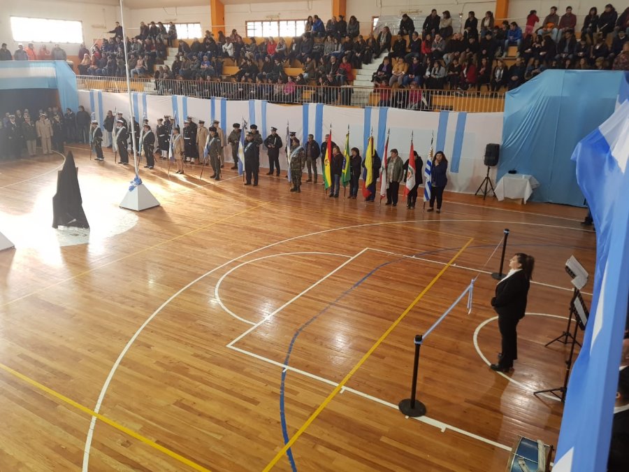 El Intendente de la Ciudad, Prof. Gustavo Melella, encabezó este viernes el acto oficial por el 168º aniversario del fallecimiento del Gral. José de San Martín. La conmemoración se llevó a cabo en las instalaciones del Centro Deportivo Municipal “Reverendo Padre Forgast” con la participación de la Concejal a cargo de la Presidencia del Concejo Deliberante, Verónica González, representantes del Tribunal de Cuentas Municipal, Secretarios y Subsecretarios del Gabinete Municipal, representantes de fuerzas militares y de seguridad, autoridades mandato cumplido, representantes del Centro de Veteranos de Guerra Malvinas Argentinas, autoridades de organismos del orden Nacional, Provincial y Local, representantes de asociaciones sindicales y de la sociedad civil, vecinos de los distintos barrios y banderas de ceremonia de diversos colegios de la ciudad, con la notoria ausencia de la mayoría de las instituciones educativas públicas provinciales que no fueron autorizadas a asistir por parte del Ministerio de Educación de la Provincia.