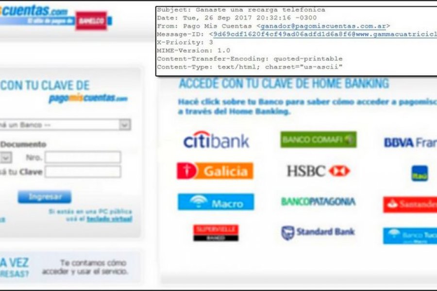 Un especialista en seguridad informática advirtió este miércoles sobre una nueva campaña de phishing (un engaño informático), que simula ser un mensaje de la plataforma de pagos PagoMisCuentas, pero en realidad roba la clave y contraseña bancaria de las víctimas.