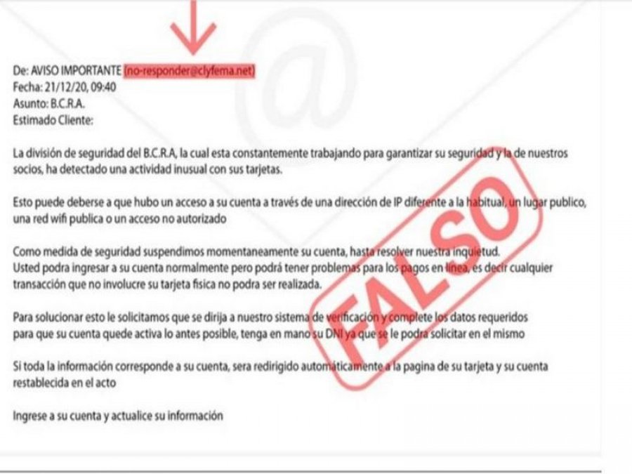 “Las direcciones de correo electrónico del Banco Central siempre finalizan indicando el dominio oficial: @bcra.gob.ar. En caso de recibir este correo o uno similar se recomienda eliminarlo inmediatamente ya que es un claro caso de phishing, es decir, un correo electrónico engañoso que aparenta ser legítimo y que es utilizado para obtener datos personales y bancarios”, agregó.