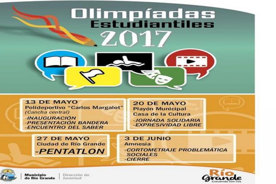 Este sábado, en el polideportivo Carlos Margalot de Chacra II, se dará inicio a las Olimpíadas Estudiantiles 2017, competencia de la que toman parte los últimos años del nivel secundario de los establecimientos secundarios de nuestra ciudad. El evento dará inicio a las 17:30 horas, las actividades que inaugurarán serán la presentación de la bandera y la ‘jornada del saber’.