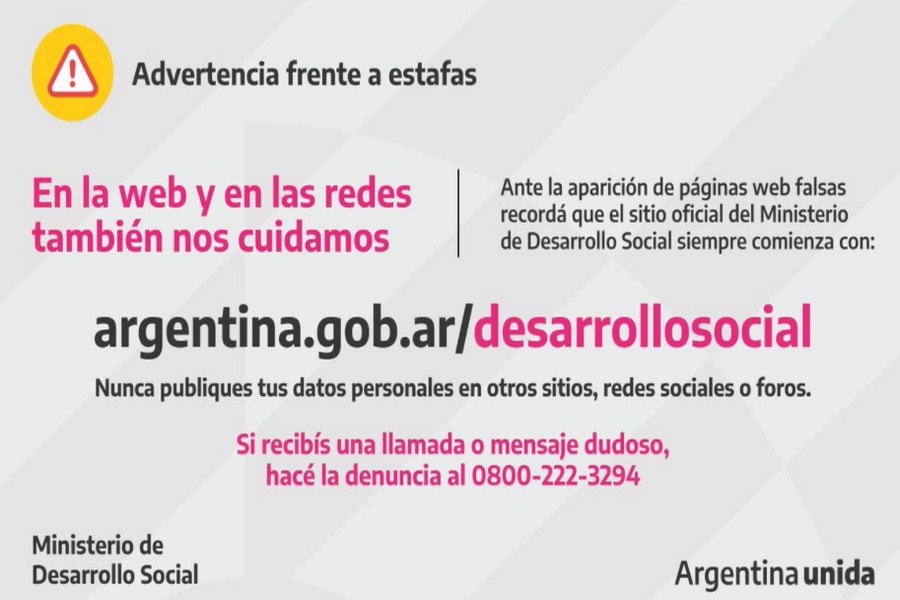 "Si te contactan para pedirte tus claves de cajero o de tu cuenta bancaria, hacé la denuncia al 0800-222-3294. También podés escribirnos a través de la web oficial del Ministerio: www.argentina.gob.ar/desarrollosocial ", subrayó el Gobierno.