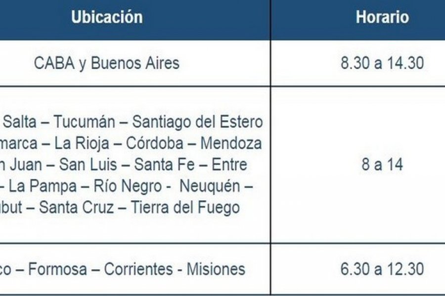 En tanto, otro grupo de provincias abrirá de 8 a 14. Son Jujuy, Salta, Tucumán, Santiago del Estero, Catamarca, La Rioja, Córdoba, Mendoza, San Juan, San Luis, Santa Fe, Entre Ríos, La Pampa, Río Negro, Neuquén, Chubut, Santa Cruz y Tierra del Fuego.