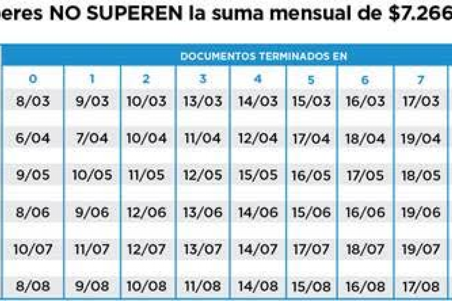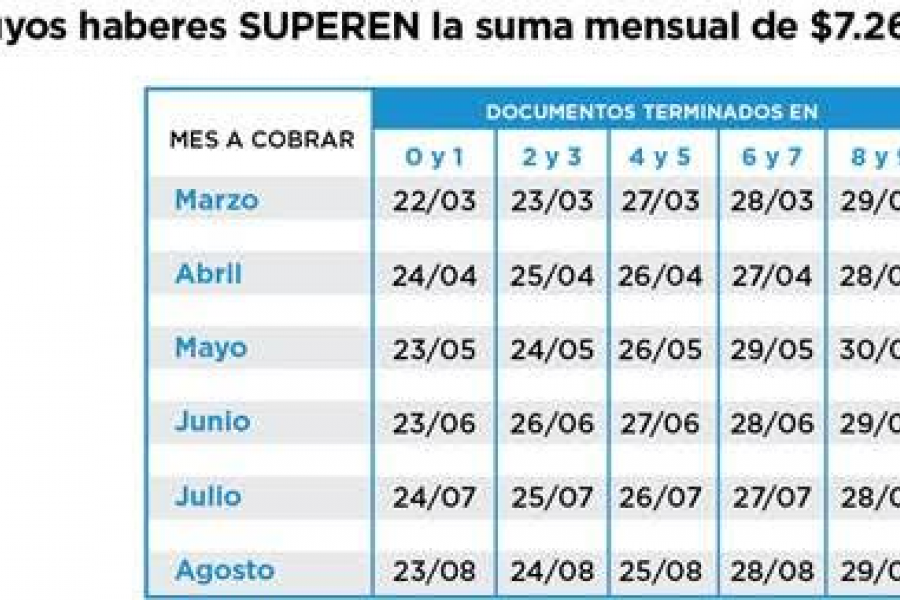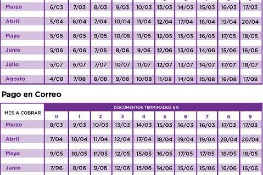 Todos los grupos de pago tienen tiempo para cobrar sus haberes hasta: marzo 10/4, abril 10/5, mayo 12/6, junio 11/7, julio 9/8 y agosto 11/9.