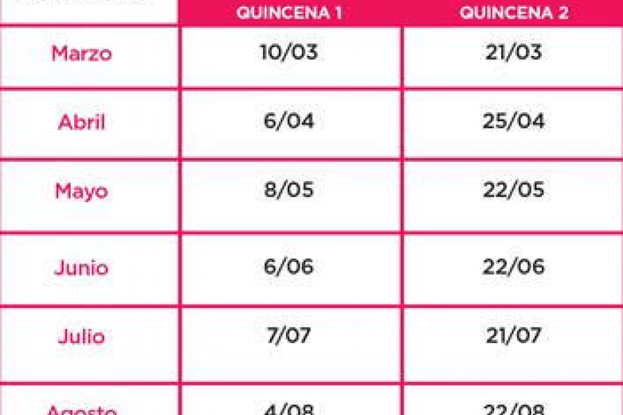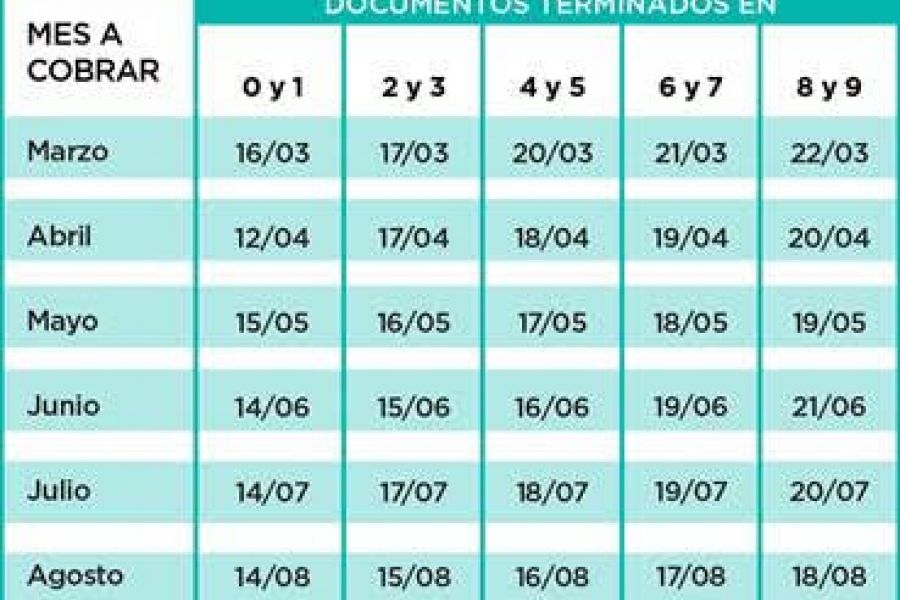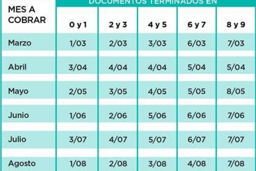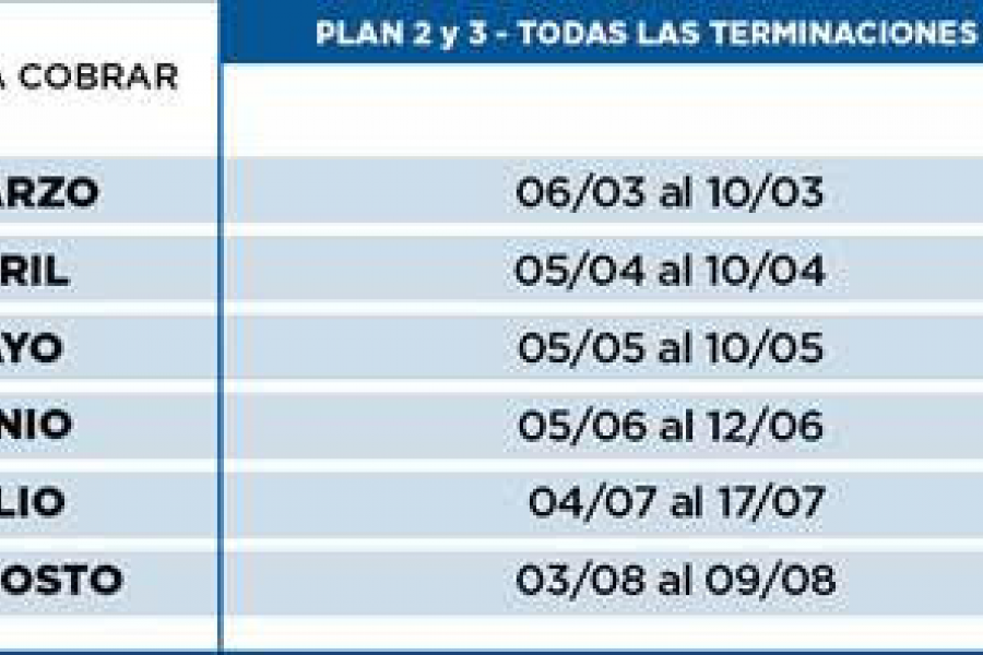 Plan 1: tienen tiempo para cobrar sus haberes hasta: marzo 10/4, abril 10/5, mayo 12/6, junio 11/7, julio 9/8 y agosto 11/9.