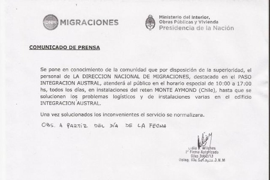 La Dirección Nacional de Migraciones, informa a la comunidad que por disposición de la superioridad, a partir de la fecha, el personal destacado en el Paso Integración Austral, atenderá al público en el horario especial de 10 a 17 horas, todos los días, en instalaciones del reten Monte Aymond (Chile), hasta que se soluciones los problemas logísticas y de instalaciones varias en el edificio Integración austral.