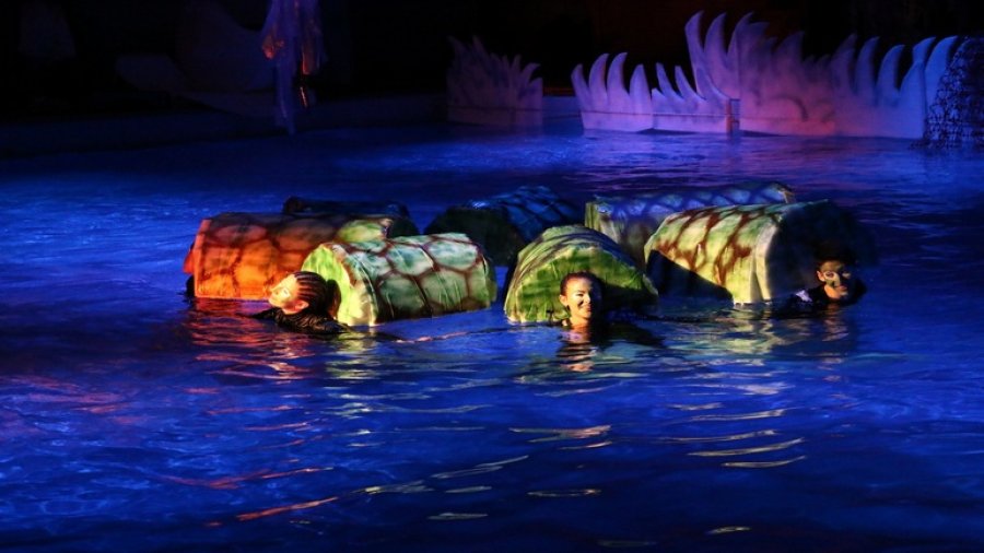 Todo el complejo deportivo se vistió con una escenografía excepcional, personajes, sonido e iluminación preparados por parte del personal municipal a la altura de una obra de teatro de primer nivel, ambientada para ser representada en una pileta olímpica.