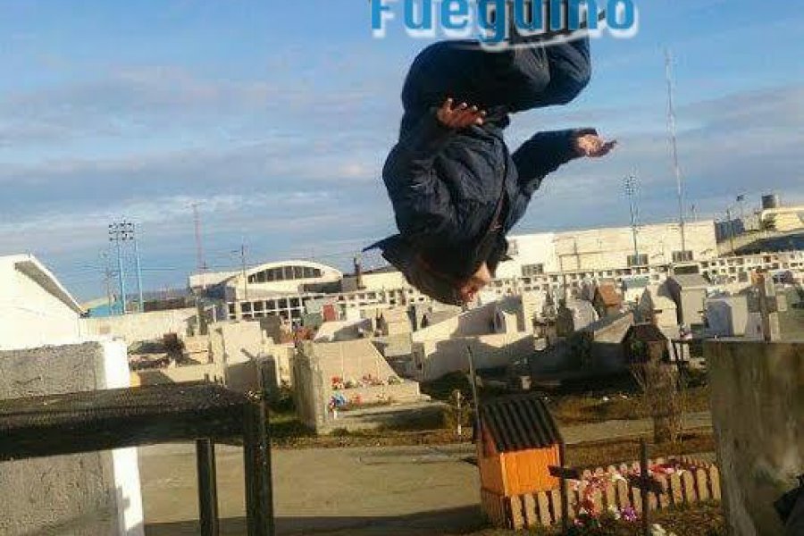 En la imagen se observa un joven de mameluco realizando una “pirueta\" a pocos centímetros de las tumbas. El mismo se encuentra saltando de una plataforma que es utilizada por las personas que tienen a sus seres queridos en nichos. Esta fotografía fue capturada a escasos metros de la Cruz Mayor.