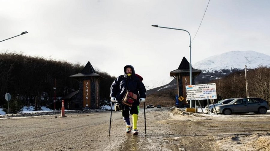 El sábado, desafiando las bajas temperaturas e incluso la nieve, el hombre llegó a Ushuaia, la ciudad más austral del mundo.