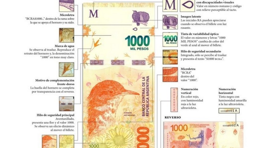Entre las principales medidas de seguridad del nuevo billete, se destacan en el anverso, la marca de agua, que reproduce el retrato del hornero y presenta, centrada en la parte inferior, la denominación “1000”. El hilo de seguridad principal cuenta con una banda aventanillada de color marrón. Además, posee un hilo de seguridad secundario, una fina banda integrada que puede verse al trasluz.
