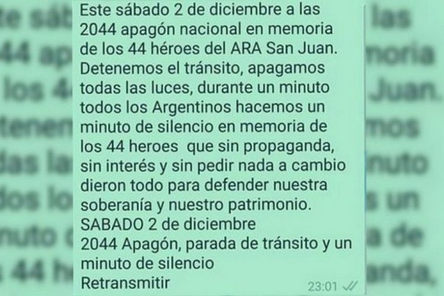\"Apagón nacional en memoria de los 44 héroes del ARA San Juan. Detenemos el tránsito, apagamos todas las luces y todos los argentinos hacemos un minuto de silencio en memoria de los 44 héroes\", destaca la convocatoria.