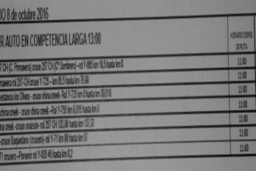 En este sentido, el responsable de límites y Fronteras. Néstor Granja, indicó “esta competencia que cuenta con un gran número de adeptos y participantes* remarcando que los cortes se realizarán en la zona de Porvenir - Onaisin (Ruta 2S7), con lo cual aquellos que deseen viajar, podrán hacerlo normalmente por la zona de Cullen (Ruta 2S9) la cual será transitable hasta que finalice la competencia. El corte se efectuará a las 11 horas, el fin de la competencia e prevé para las 18 horas.