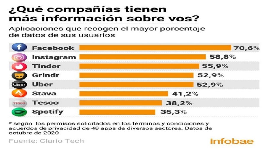 Facebook e Instagram lideran el ranking de las aplicaciones que mayor porcentaje de información almacenan: el 70,6% y 58,8% respectivamente, según un análisis de la empresa de ciberseguridad Clario Tech citada por el sitio Statista y que abarca a las plataformas más populares. En tercer y cuarto lugar están Tinder y Grinder que recogen el 55,9 % y 52,9 % de la información que solicitan. Uber por su parte, también guarda este último porcentaje de datos.
