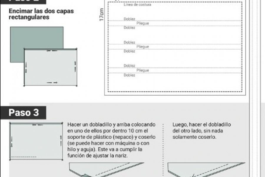 Paso 4: hacer tres pliegues de ambos laterales de 1,5 cm, cada uno con dirección hacia abajo, considerando que el soporte de plástico quede en el ruedo de arriba. La función del pliegue es permitir la extensión de la barbilla.
