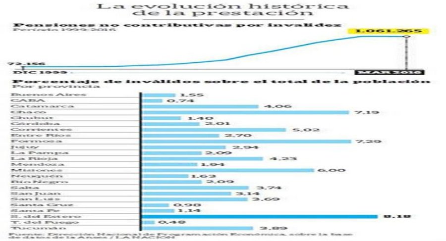 Según cifras de la Dirección Nacional de Programación Económica sobre la base de datos de la Anses, la provincia con mayor porcentaje de inválidos sobre el total de la población es Santiago del Estero, con un 8,8 por ciento. Y la de menor es Tierra del Fuego, con el 0,48 por ciento.