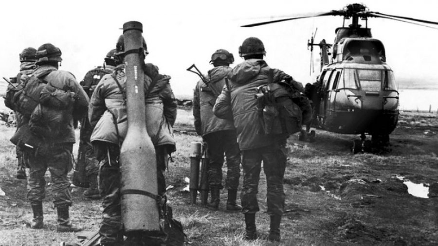 Los comandos del Regimiento 601 que operaron en la isla Gran Malvina, uno de ellos carga en sus espaldas un misil antiaéreo Blow Pipe