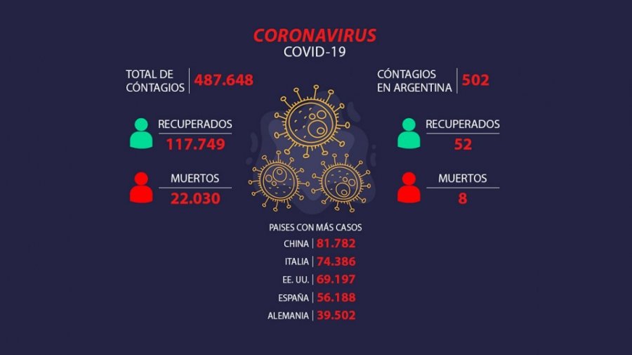 Según cifras oficiales de la Organización Mundial de la Salud (OMS) el Coronavirus Covid-19 infectó a un total de 487.648 personas en todo el mundo, si bien hay una total de 117.749 de pacientes recuperados, la cifra de un total de 22.030 de víctimas fatales no deja de impactar.