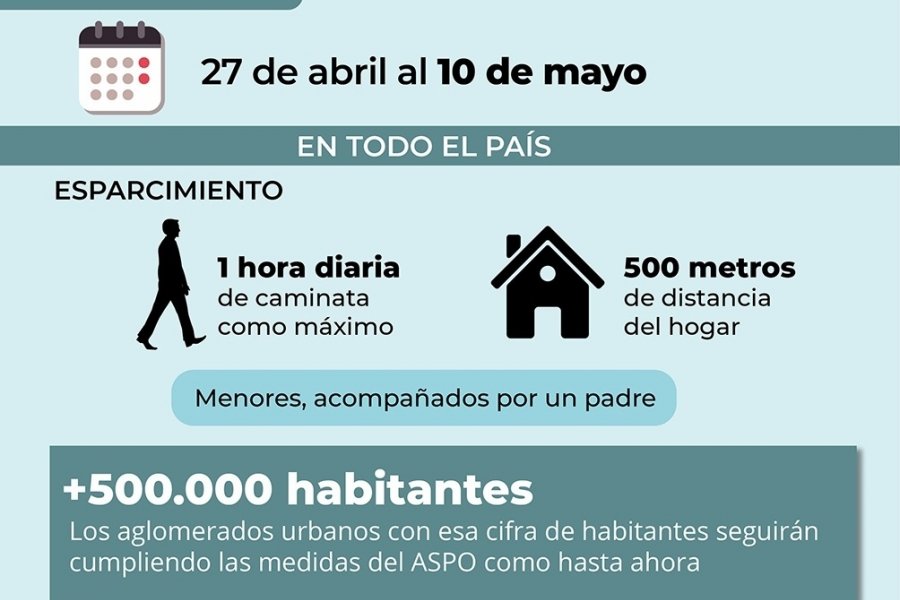 - Los grandes aglomerados urbanos son los lugares de mayor riesgo de transmisión del virus. Por ese motivo, todos los aglomerados urbanos de más de quinientos mil habitantes en el país seguirán cumpliendo las medidas de aislamiento social, preventivo y obligatorio como lo hicieron durante los últimos quince días.
