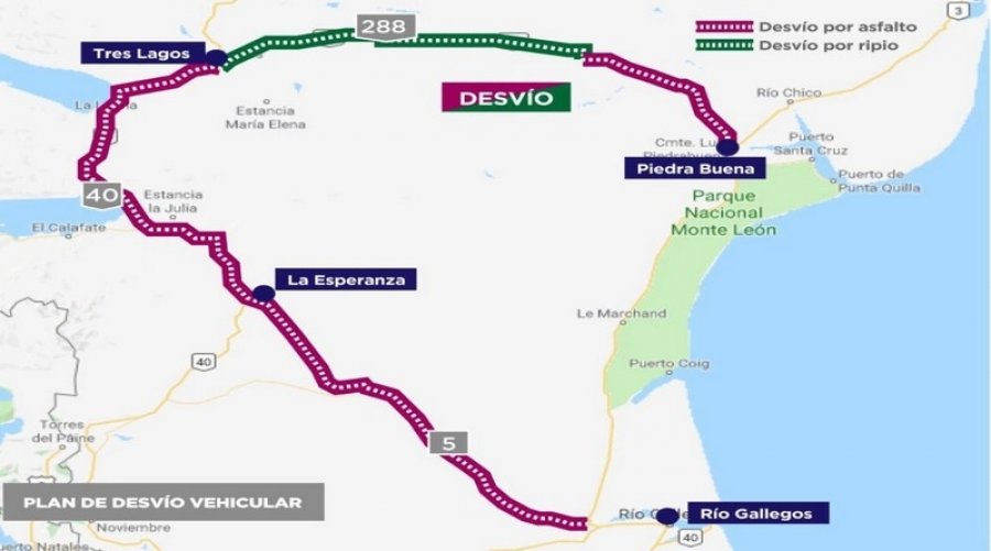 Los usuarios que se dirijan hacia Tierra del Fuego por la Ruta Nacional 3 pasando por la ciudad de Río Gallegos podrán desviarse a la altura de la localidad de Piedrabuena ingresando por la RN 288 hasta llegar a Tres Lagos, donde luego deberán tomar la RN 40 y posteriormente acceder a la RP 5. Quienes estén viajando desde Río Gallegos hacía el norte de la provincia podrán hacer el mismo camino a la inversa.