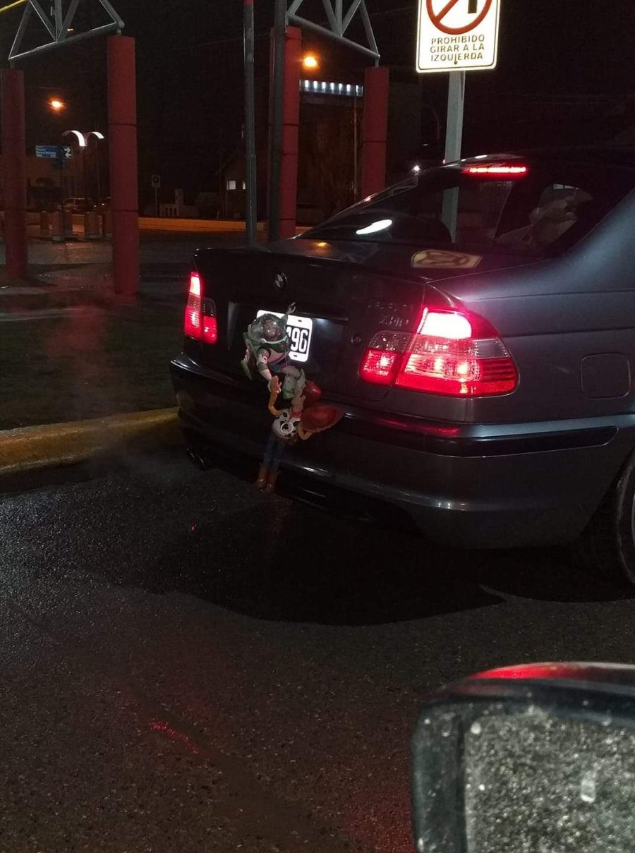 Se trata de una recreación captada por imágenes de vecinos, donde los muñecos Woody y Buzz Lightyear, personajes principales de la saga, se encuentran colgados de un automóvil que circula por las calles de Río Grande. La imagen recrea una escena de una de las películas en la que ambos personajes intentan rescatar al resto de los juguetes.