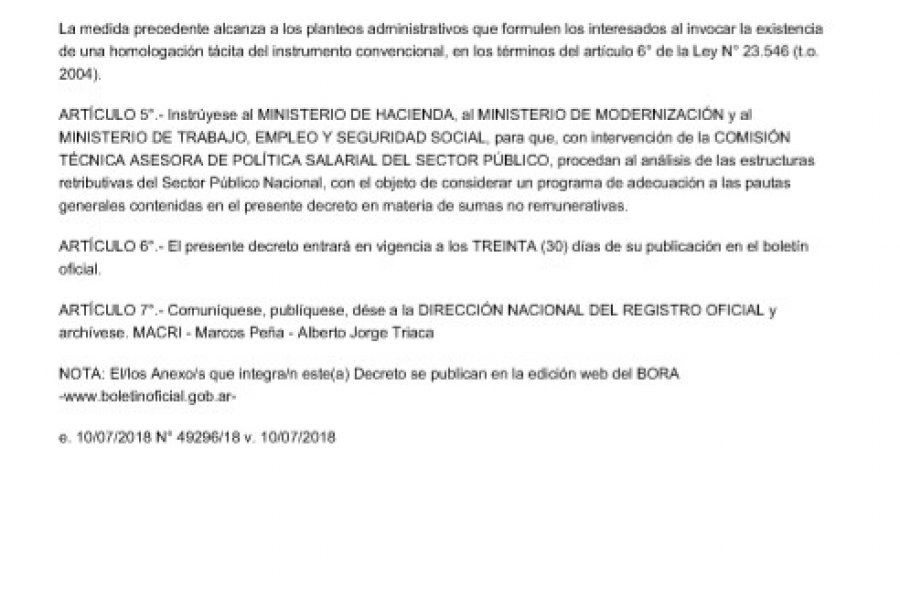 La medida también se extiende al Estado, por lo que se instruye al Ministerio de Hacienda, Modernización y Trabajo para que, \"con intervención de la comisión técnica asesora de política salarial del sector público, procedan al análisis de las estructuras retributivas del sector público nacional, con el objetivo de considerar un programa de adecuación a las pautas generales contenidas en el presente decreto en materia de sumas no remunerativas\".