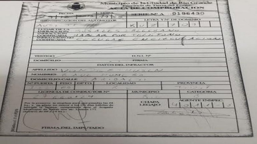 La copia de la multa que le labraron al concejal Raúl Von Der Thusen, flamante presidente del Concejo Deliberante de Río Grande.