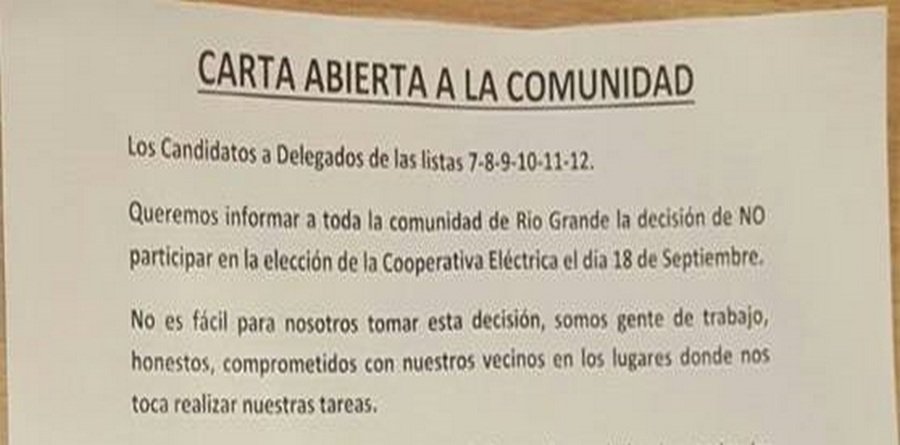 Queremos informar a toda la comunidad de Rio Grande la decisión de NO participar en la elección de la Cooperativa Eléctrica el día 18 de Septiembre.