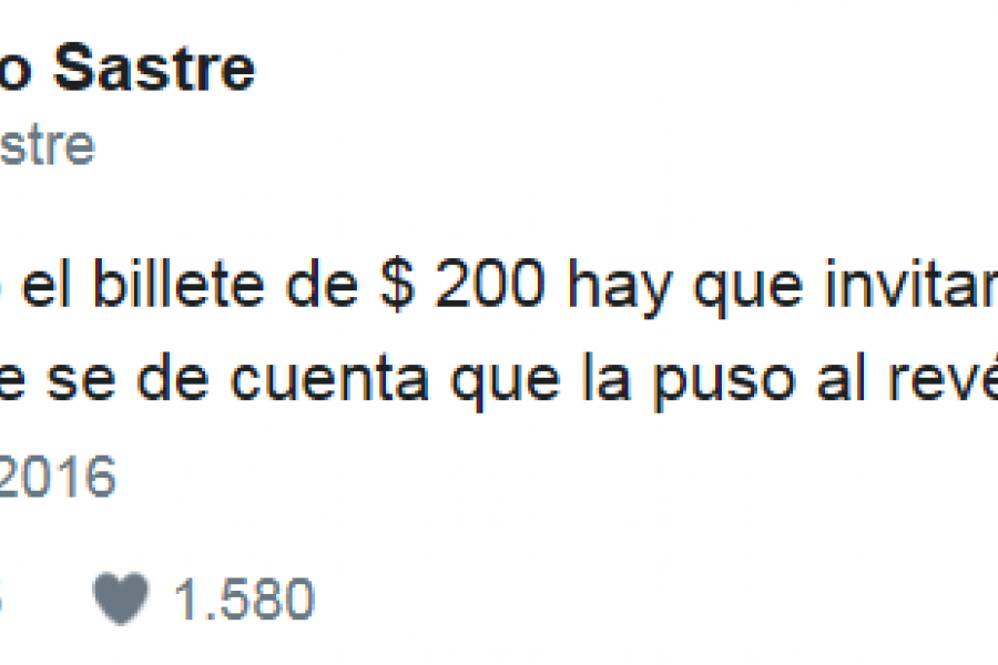 El intendente de Puerto Madryn, lugar donde las ballenas se quedan a parir a sus crías antes de partir hacia Puerto Pirámide, en Península Valdés, escribió un irónico tuit: “Al que diseñó el billete de 200 pesos hay que invitarlo a conocer ballenas y que se de cuenta que la puso al revés”, expresó Ricardo Sastre en su red social. También hubo comentarios del mismo tono de muchas personas que habitan en esta región del país.