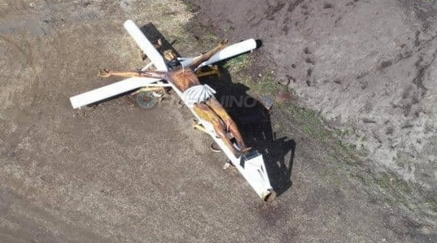 En el día de ayer, el Cristo fue trasladado hacia el ingreso de la ciudad para ser colocado nuevamente, pero un percance particular aconteció; uno de los brazos del monumento tallado en madera de lenga, no coordina con la enorme cruz tubular de hierro.