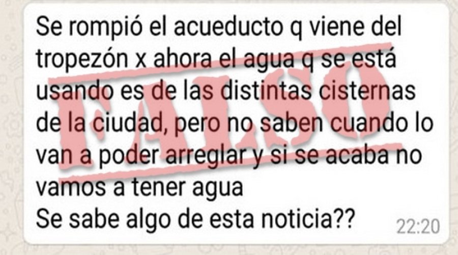 El mensaje decía así “Se rompió el acueducto que viene del tropezón x ahora el agua q se está usando es de las distintas cisternas de la ciudad, pero no saben cuando lo van a poder arreglar y si se acaba no vamos a tener agua”.