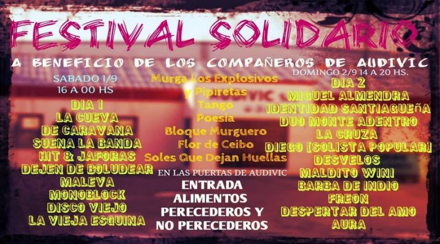 Sábado y domingo artistas autoconvocados realizarán un festival solidario en el playón de la empresa Audivic en Río Grande. La entrada es un alimento y convocan a la comunidad a participar “para acompañar a los trabajadores y sus familias en este difícil situación”.