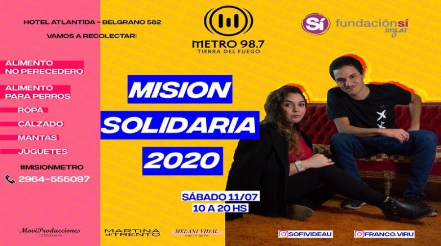 Durante este sábado 11 de julio a nivel nacional, la radio Metro Bsas (95.1) y Fundación Sí realizaran una jornada solidaria. En la ciudad de Río Grande en el programa a estará a cargo de Sofía Videau y Franco Ciarlante. El mismo conectará con un programa de de Telefé que conducirá Andy Kusnetzoff.