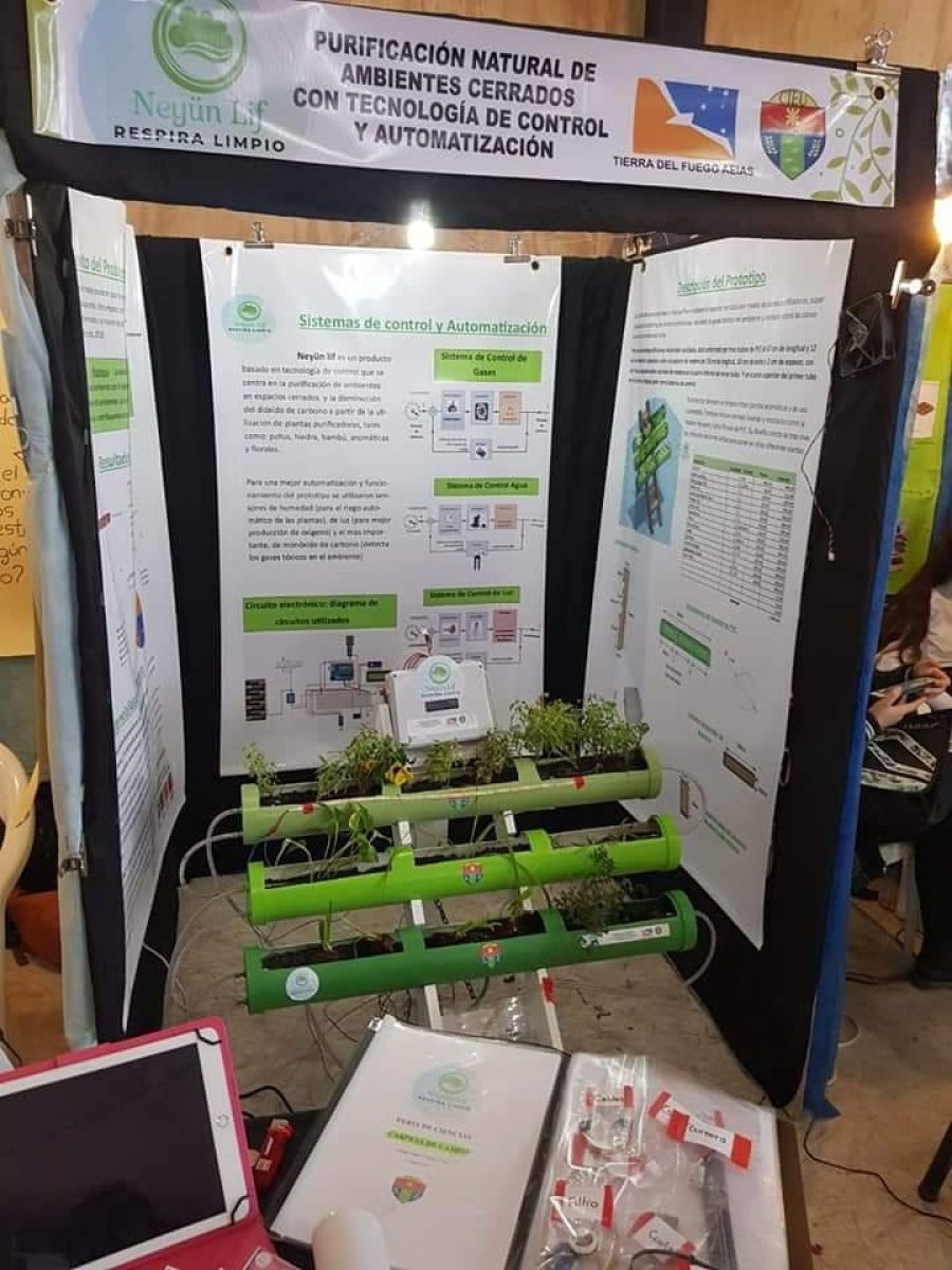 Estudiantes de tercer año del ciclo básico del Colegio Integral Educación Ushuaia (CIEU) desarrollaron un purificador de aire natural para ambientes cerrados automatizado con tecnología de control. Además cuenta con un sistema para el control de gases tóxicos, uno de riego y otro de iluminación. Con estos tres sistemas de control se logra obtener la eficiencia en la purificación del aire como también automatizar su mantenimiento.