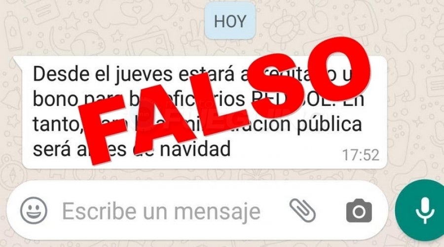 Se trata de una cadena de mensajes que circula por WhatsApp en la que supuestamente el gobernador electo, Gustavo Melella, confirma el pago de un bono navideño para los beneficiarios de planes provinciales y empleados públicos.