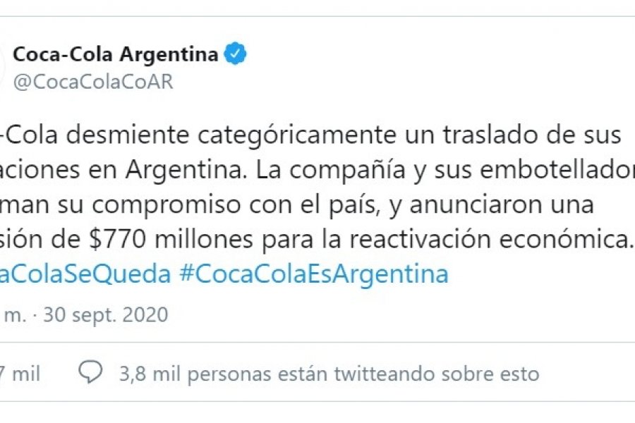 Sin embargo, tanto Coca-Cola como Gentile salieron a desmentir estos rumores. Primero lo hizo la famosa marca de gaseosas: \"Coca-Cola desmiente categóricamente que esté contemplando un traslado de sus operaciones en Argentina. La compañía y sus embotelladores seguirán operando en el país con el mismo compromiso con que vienen haciéndolo desde hace 78 años\", informó mediante Twitter.