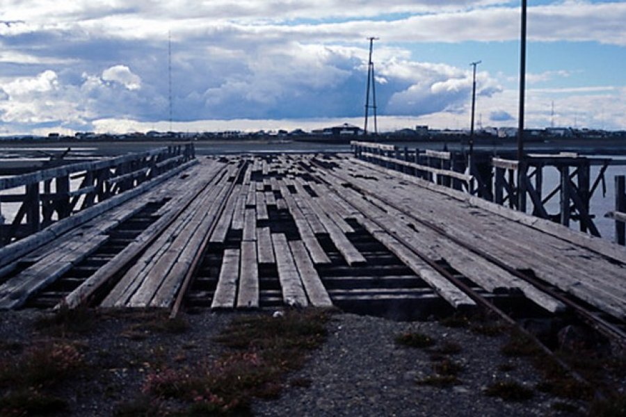 Esta foto muestra aparentemente un muelle público en Río Grande, probablemente cerca 1940 (7). Hay una vía simple de trocha angosta.