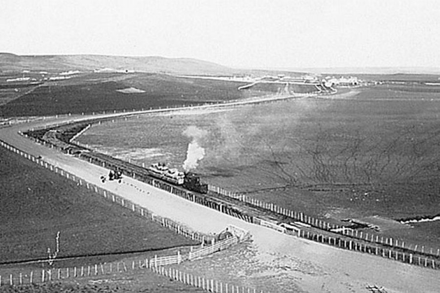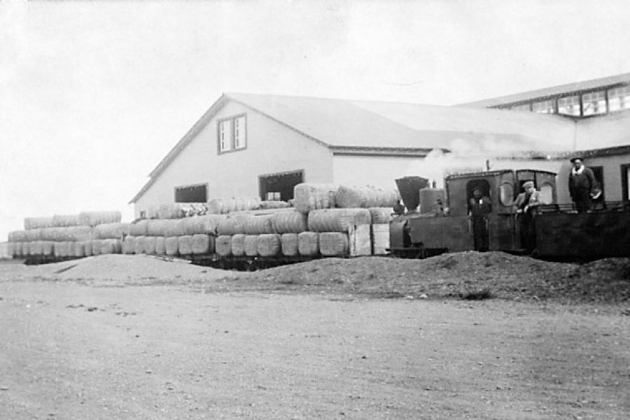 La fotografía de arriba muestra el galpón de esquila de la estancia. La punta de riel del ferrocarril está al frente como se muestra en la fotografía más antigua, debajo (5). Se ve una locomotora con su ténder, pero también están dos vagones. Claramente estaban dos, o más, líneas paralelas aquí.