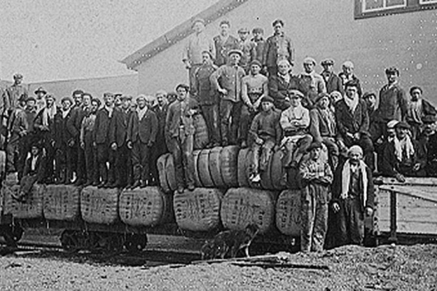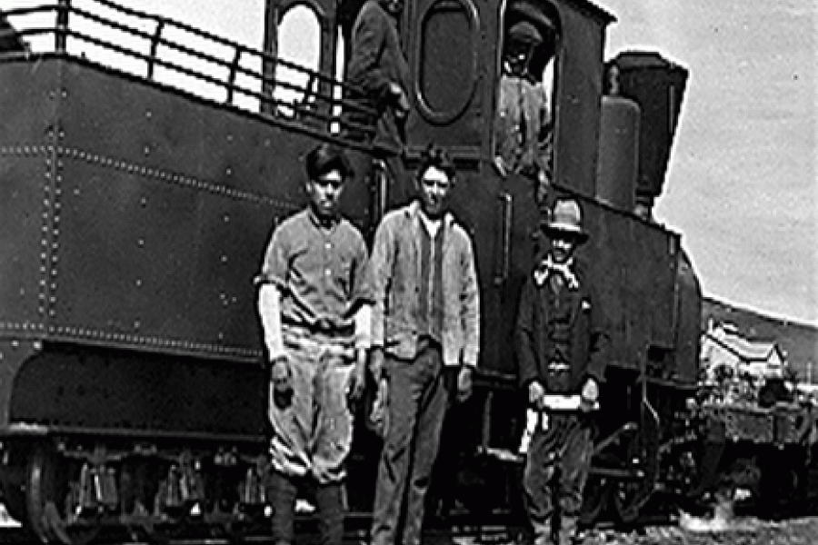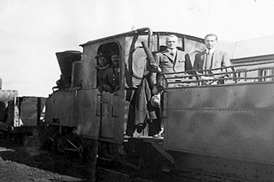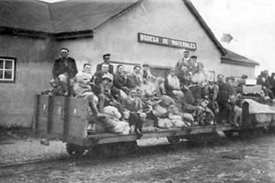 La fotografía fue tomada probablemente en la terminal de la línea al frigorífico y puerto, fuera de lo que parece ser el galpón propio de la estancia
