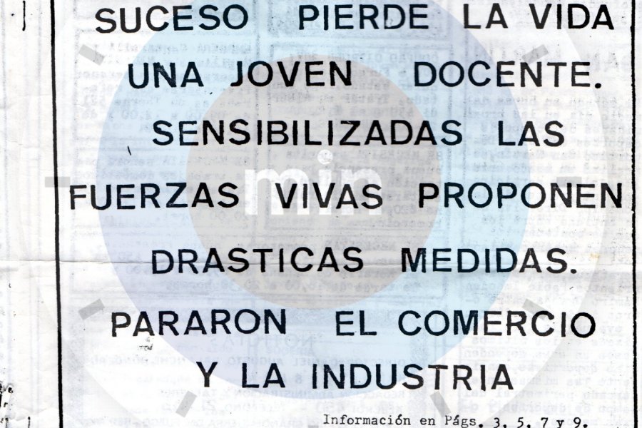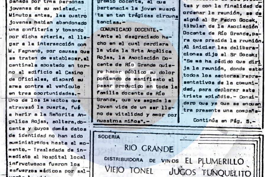 “En un marco de dolor e indignación ante el irreparable suceso, la comunidad local, comentó de diverso tono el episodio. Fue así que a medida que avanzaba la mañana, comenzó a vivirse un clima de tensión. (..) La primera manifestación de pesar llegó precisamente del gremio docente al que pertenecía la joven muerta en tan trágicas circunstancias”.(Noticias – Rio Grande- martes 14 de diciembre de 1982)