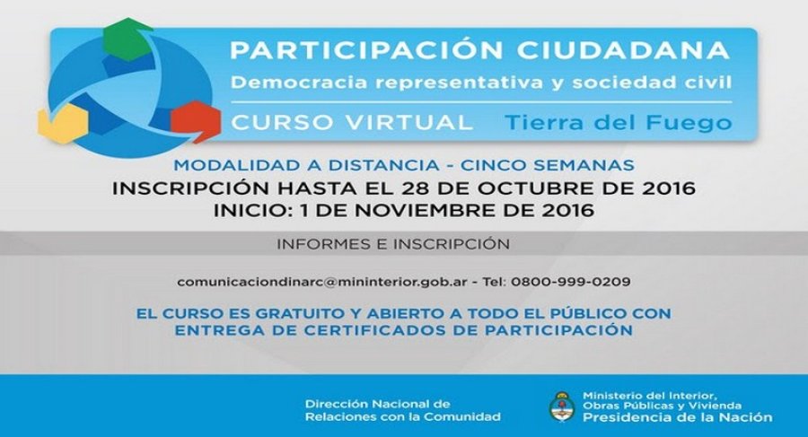 Del 1 al 5 de diciembre se dictará en Tierra del Fuego el primer curso de Participación Ciudadana, que propone ampliar y mejorar los conocimientos de los ciudadanos y organizaciones de la sociedad civil, como también de funcionarios públicos con relación a la construcción de ciudadanía y al sistema democrático.