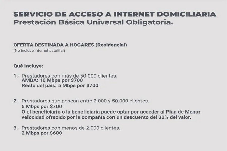 La prestación básica universal obligatoria de acceso a internet tiene diferentes precios y modalidades según la cantidad de abonados de la empresa que presta el servicio.