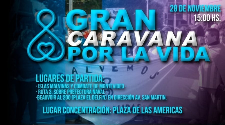 Organizaciones Provida bajo el lema #SalvemosLasDosVidas este sábado 28 de noviembre convocan a una Caravana en Rio Grande que partirá de 3 puntos de la ciudad para confluir en la rotonda de la plaza de las Américas para posteriormente en el Cono de Sombra realizar un acto para manifestarse en contra del proyecto de ley enviado al Congreso por el Gobierno Nacional para establecer el aborto libre en Argentina.