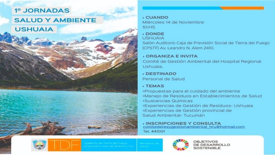 El Ministerio de Salud anunció la realización de las 1° Jornadas Hospitalarias “Salud y Ambiente” el miércoles 14, a las 10 horas, en el salón auditorio de la Caja de Previsión Social de Tierra del Fuego de la ciudad de Ushuaia.