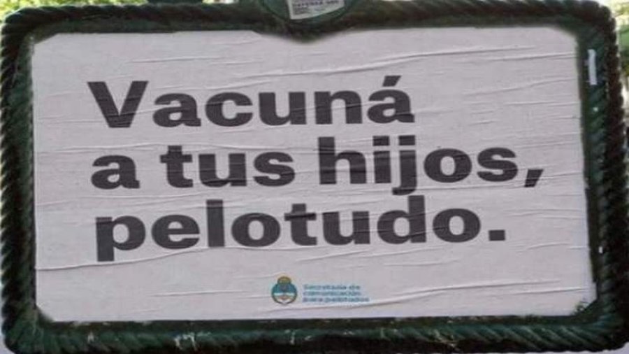 \"Vacuná a tus hijos, pelotudo.\", indica el letrero que se pudo observar en varias calles de Buenos Aires y que también inunda las redes sociales. El mismo está firmado por una denominada Secretaría de Comunicación para Pelotudos y se puede visualizar también el escudo nacional.